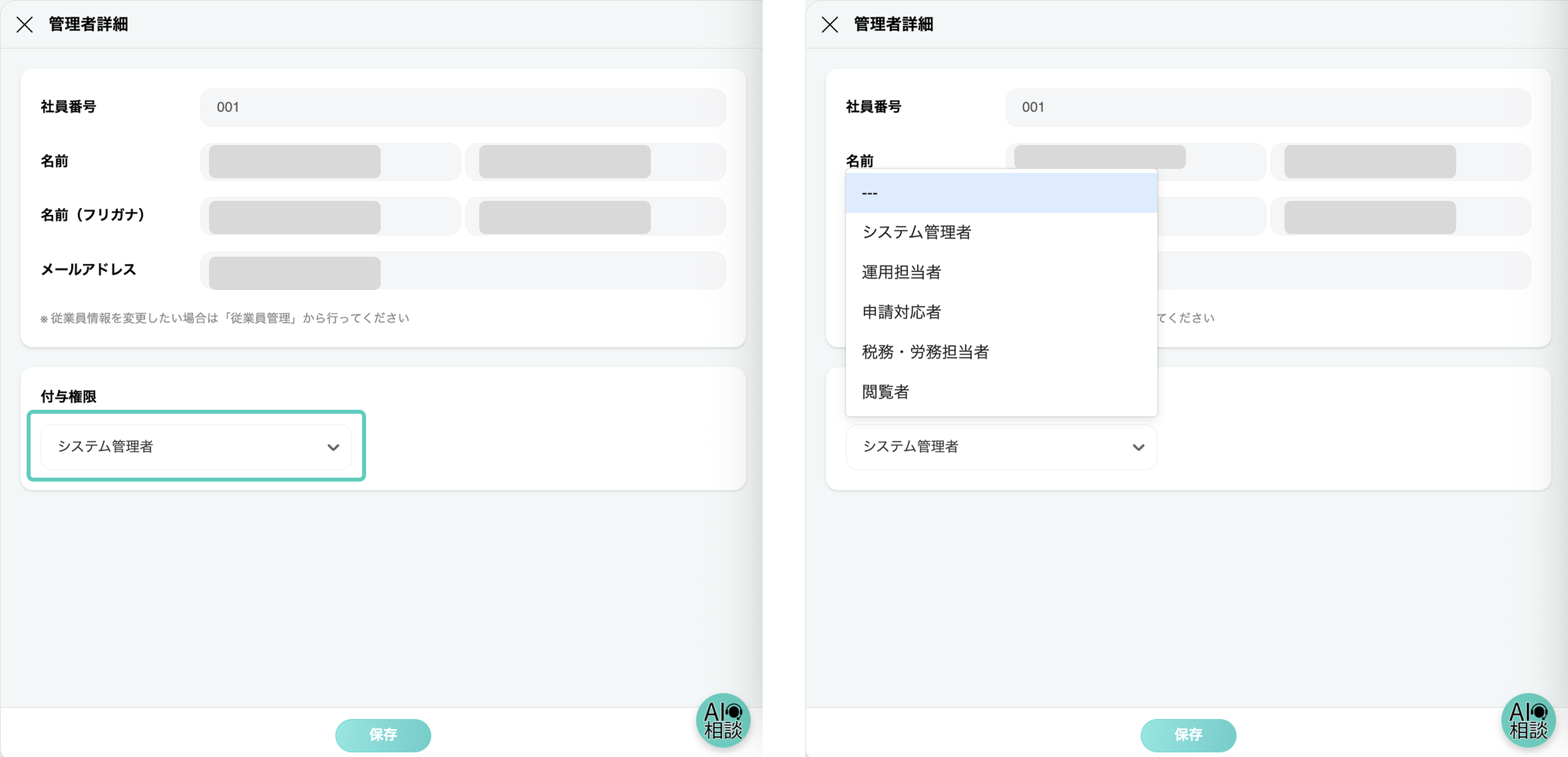 - 「付与権限」から付与したい権限を選択し、下部の「保存」ボタンをクリック